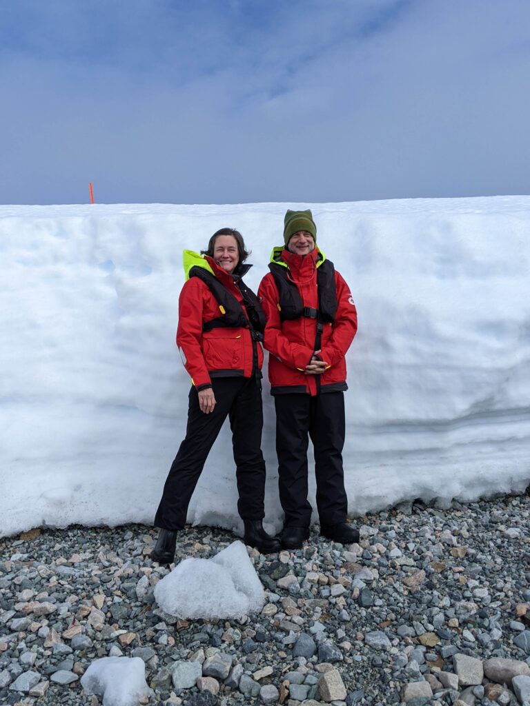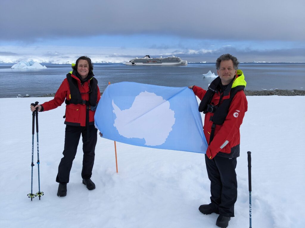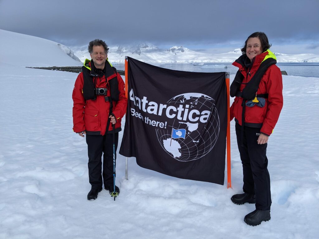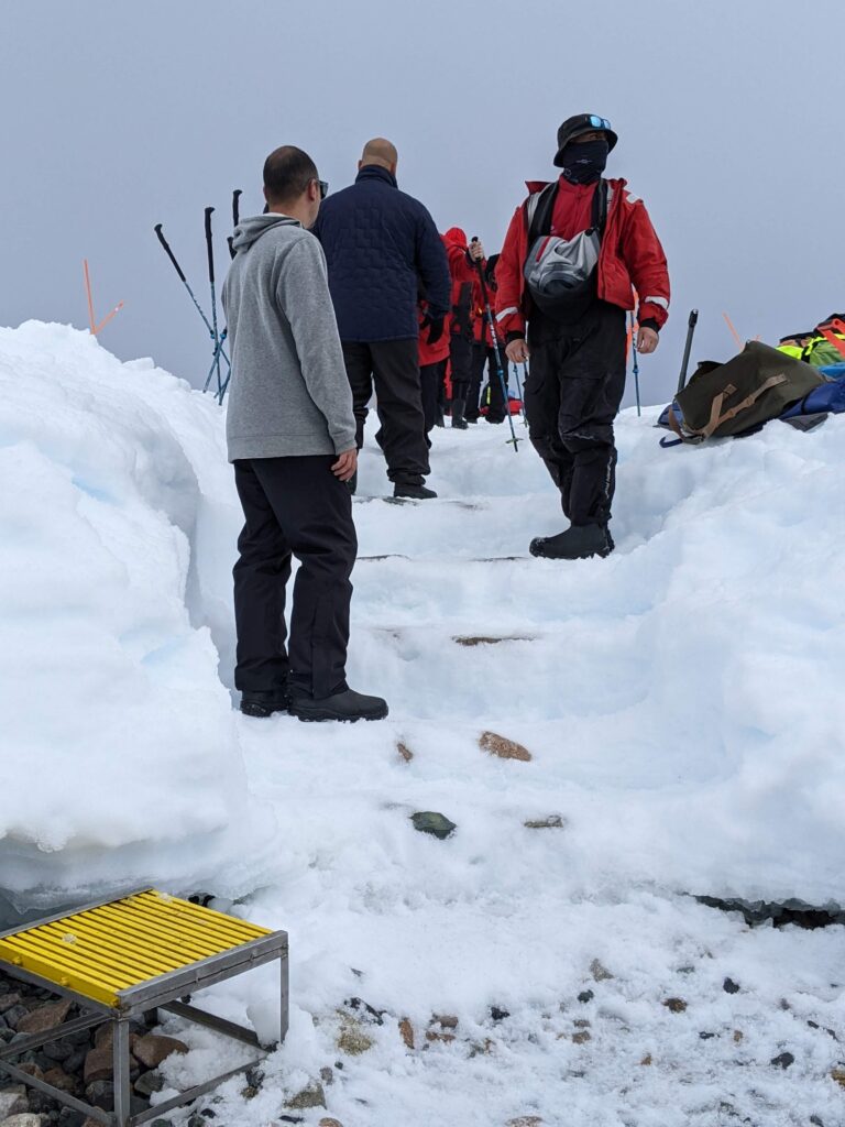 Our zodiac dropped us off on a rocky beach, and then we walked up some snow steps for a tour around the land. Our previous shore excursions were on islands, but today was our first time stepping on the continent itself. To mark the occasion, the excursion crew had placed flags along the hiking trail, and they were on hand to take photos.