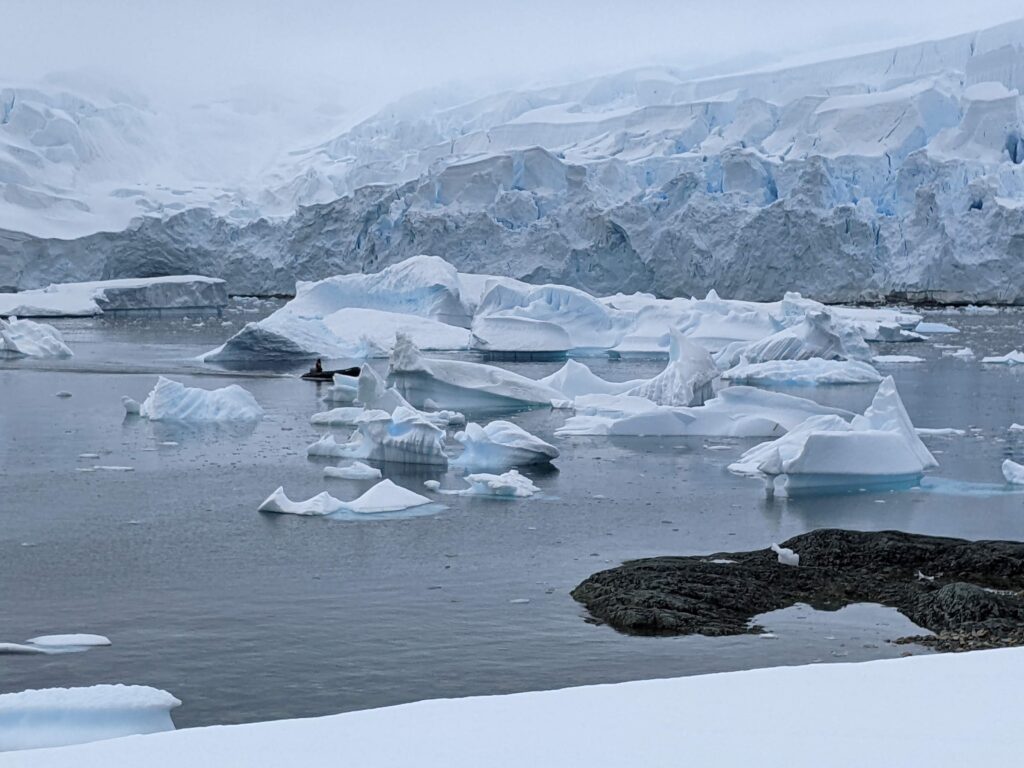 While we were on land, a whale swam into the harbor and cruised around for a while. As a zodiac came zipping into the cove to pick up passengers, I heard Olivia over the radio, “Incoming zodiac, slow way down. There’s a whale right beside you.” A short time later, as we were in our zodiac going back to the ship, a whale surfaced directly in front of our boat. It seemed like it was just five feet in front of us.
