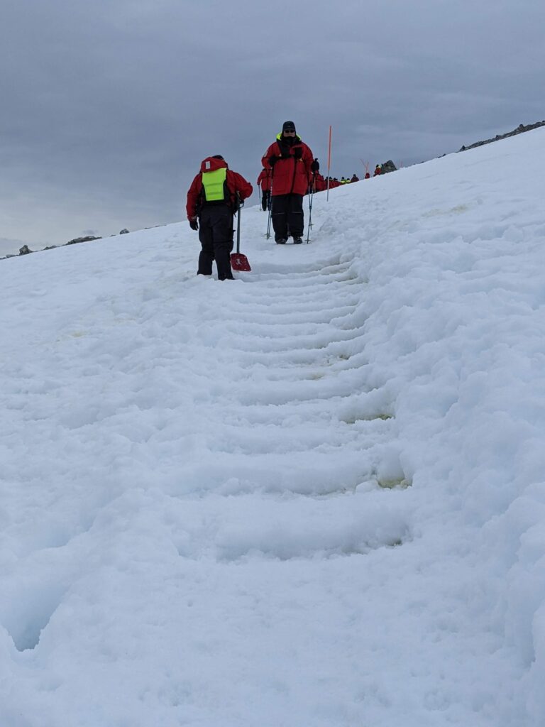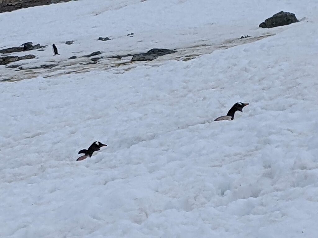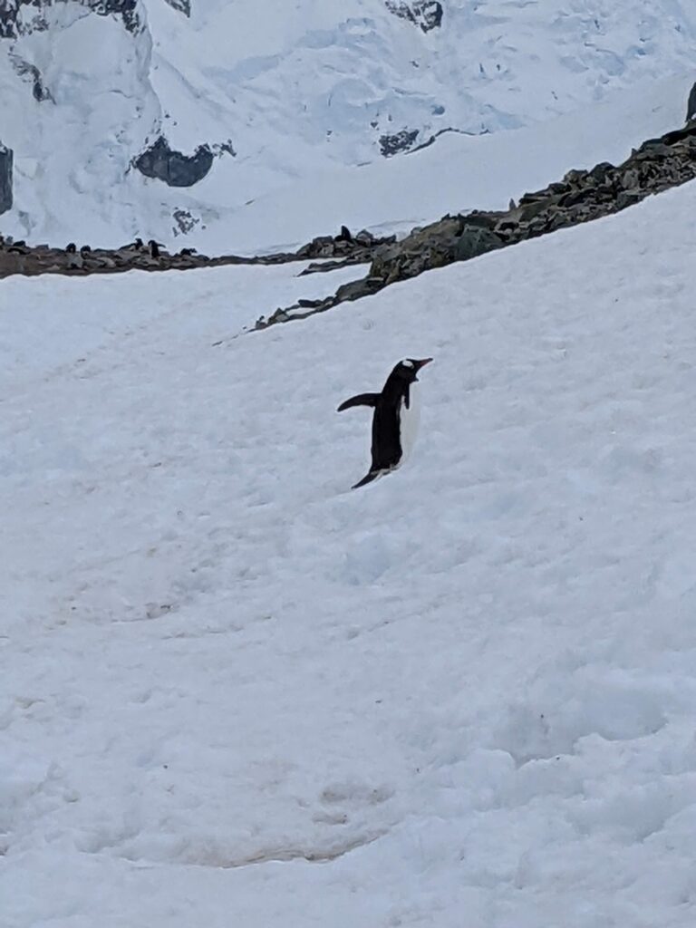 From there we zigzagged up the mountain. At the top of our path, there was a large area with penguins roosting. There were a couple of penguins highways that went from that roost area to others higher up the mountain. It was so cute to see the birds waddling through the snow to go from one place to another.