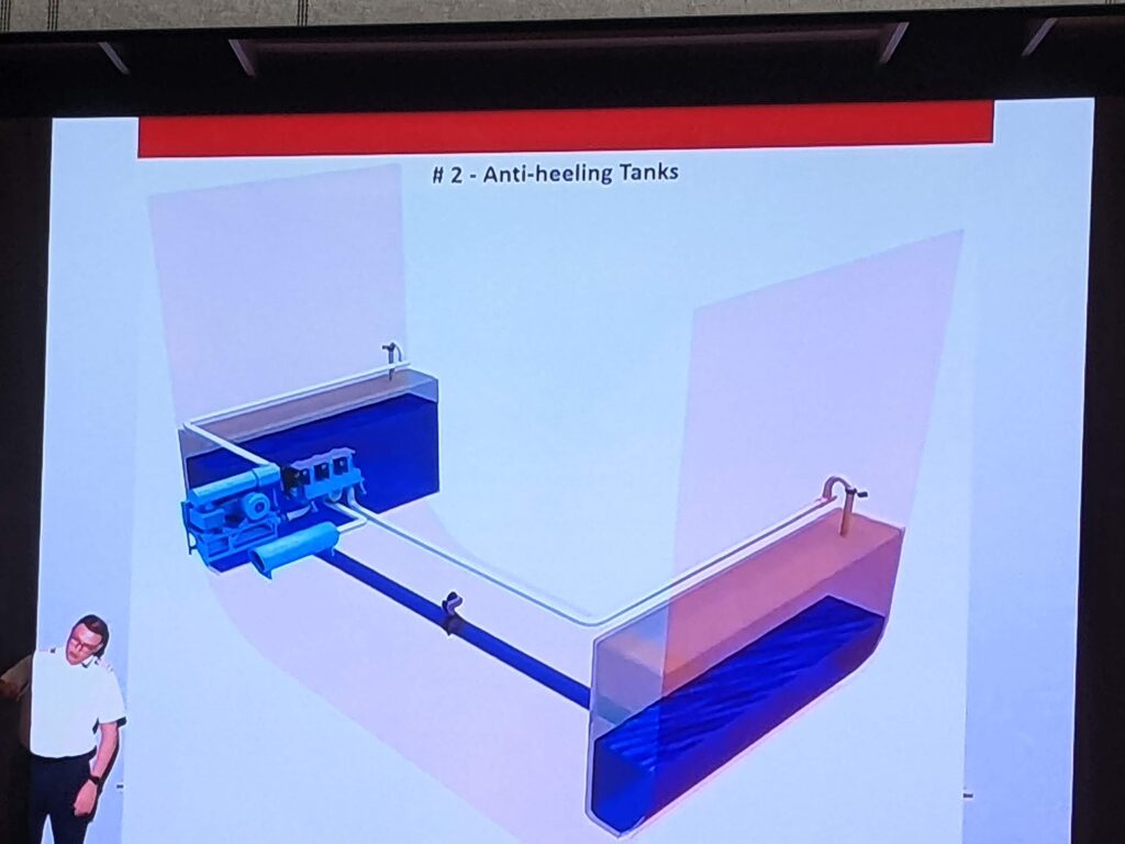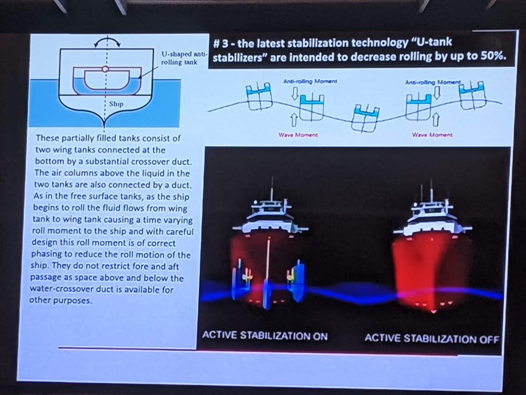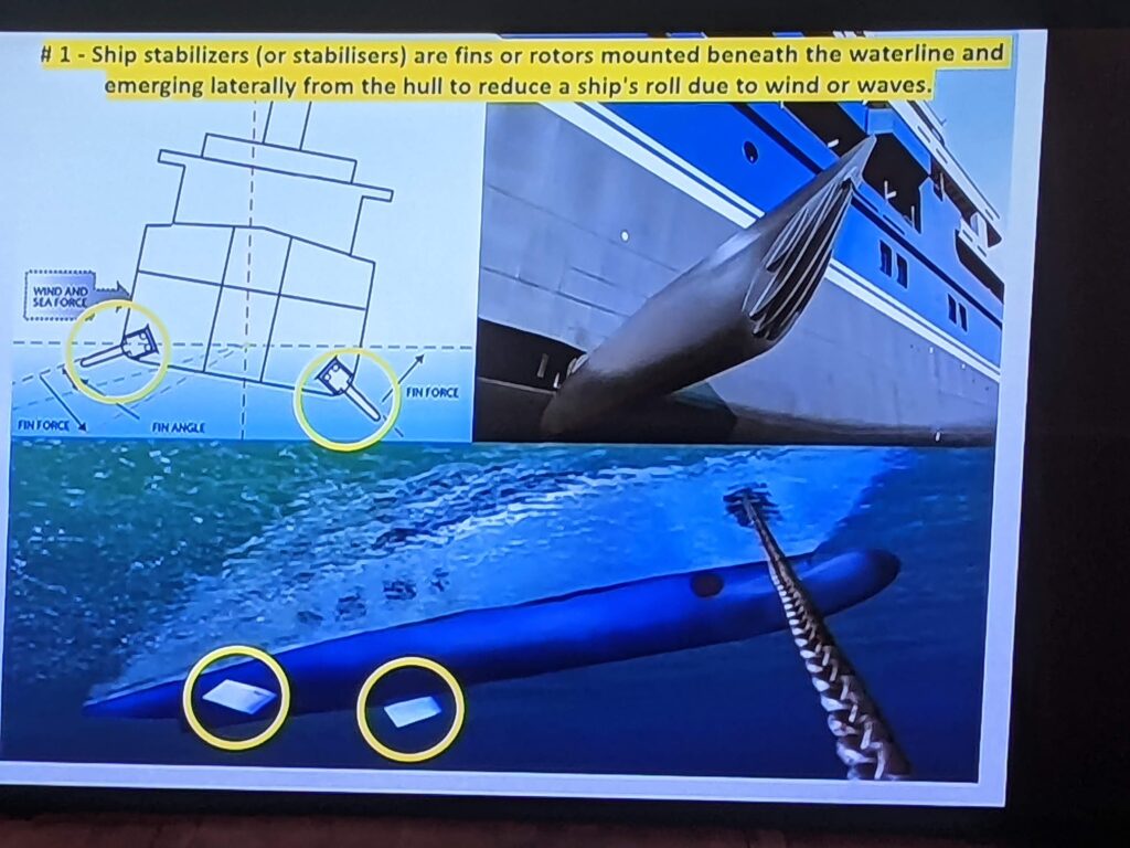 The captain gave a lecture this morning about the technical and operational aspects of the ship. We learned that the ship has three stabilization methods, and they are all currently deployed as we cross the passage.